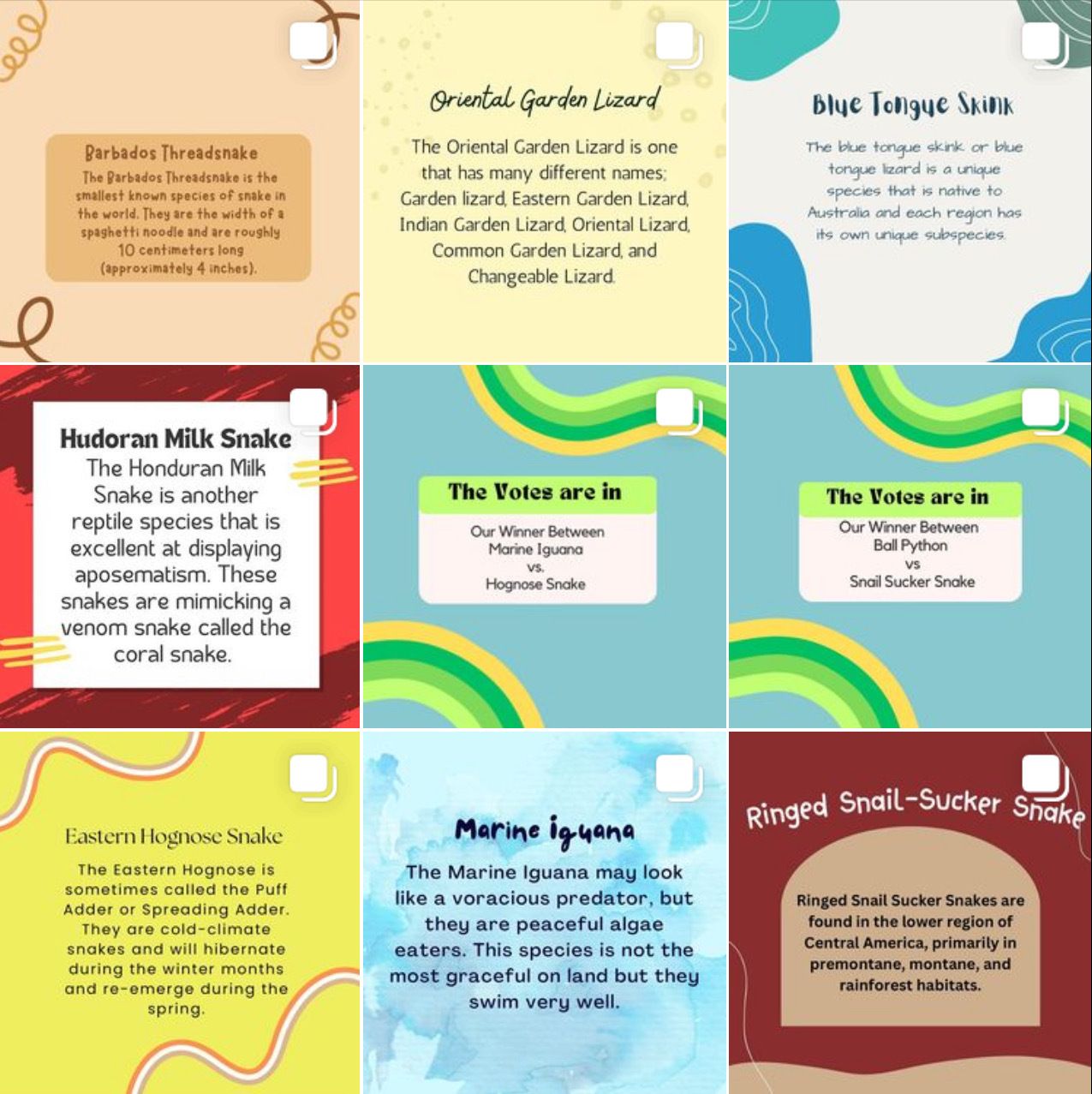 These posts were written at a middle school level. During each Sunday’s Introduction Reel, body shape, coloration, and, in some cases, venom were addressed. In rare cases, a few posts had more scientific words, exposing followers to new vocabulary. Stories from the introduction week were saved as Highlights for quick references to the terms used. For example, a whole Highlight was dedicated to the International Union for Conservation of Nature (IUCN) Red List species status designations.