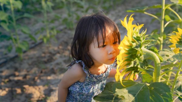 «She opens the gate and walks in the garden. The tall fuchsia hollyhocks first catch her eye with their drooping double flowers, attached to the stem by lime-green finger-like leaves. She goes around the plant, from one flower to the other, lured by their bold colour and intricate petals. Like little ballerinas, they seem to dance in the wind. Standing tall beside them are giant yellow sunflowers, some so heavy that they bow to the little girl, showing their rich brown hearts huddled by long sheer yellow petals. Standing up to them, she measures herself to the tall barky stems. She must stand on her toes to peer into the heart of the flowers. It takes a few moments before she hears the buzzing of yellow bees flying around. Putting her face into one flower, suddenly she sees a few of them busily walking about. She has never been stung, so she just enjoys the sound of the buzzing and the brightness of the sun lighting up the yellow flowers. She pulls back to look at the little forest of giant sunflowers standing so tall, trumpeting to the sun and the sky. She lifts her head to join the choral with her vibrating delight as the sun drops warm kisses on her cheeks.