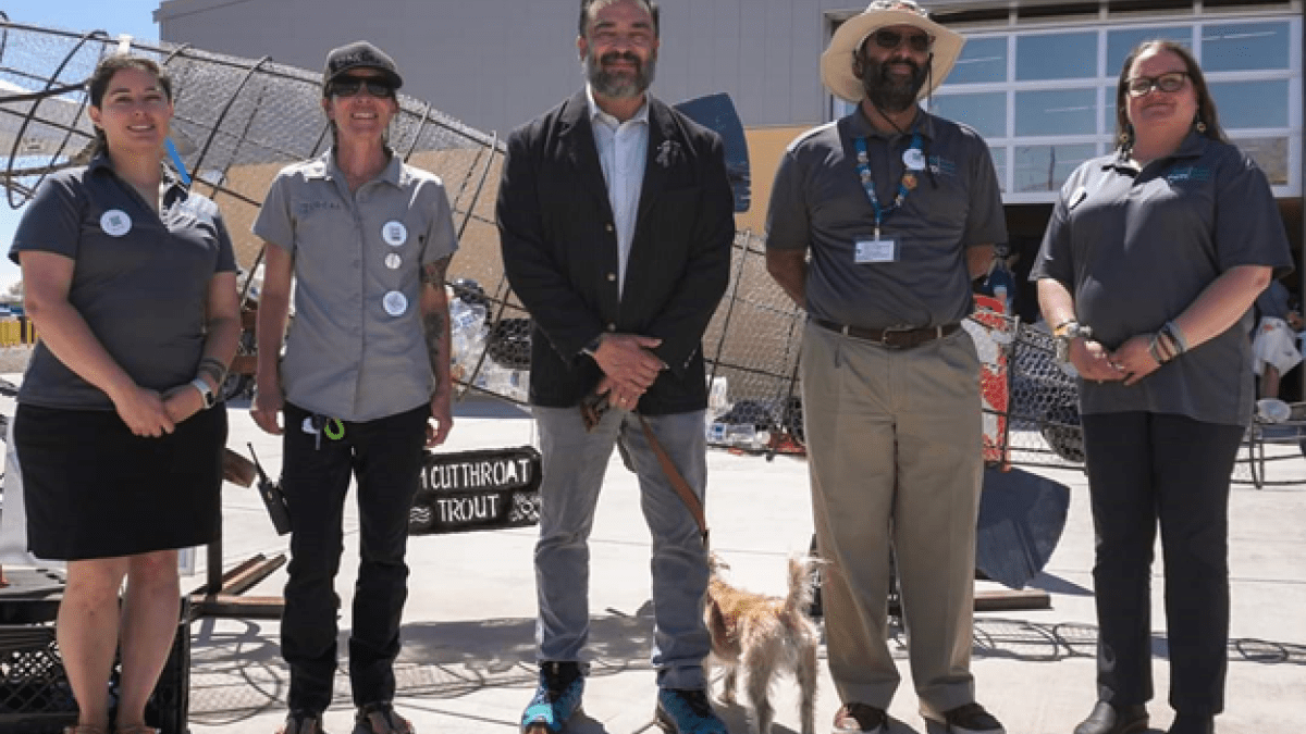 Left to Right, Vanessa Barela, Therese Baca-Radler, Dr. Arsenio Romero (NMPED Secretary of Education), Shafiq Chaudhary, and Patricia Gharrity at Earth Day Festival Therese and Vanessa Organized with Garbanzo Snout the Cutthroat Trout Sculpture. Photo credit: Greg Smith
