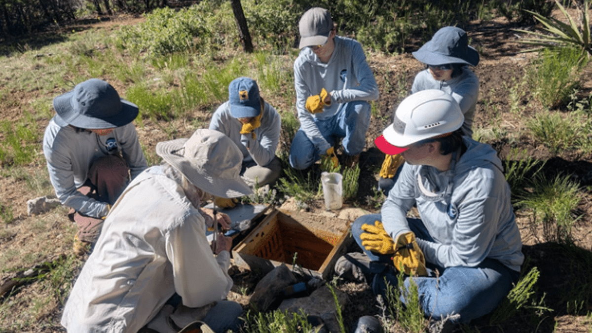 Summer 2024 Youth Conservation Corps members repairing a wildlife drinker with Friends of the Sandia Mountains. Photo credit: Vanessa Barela