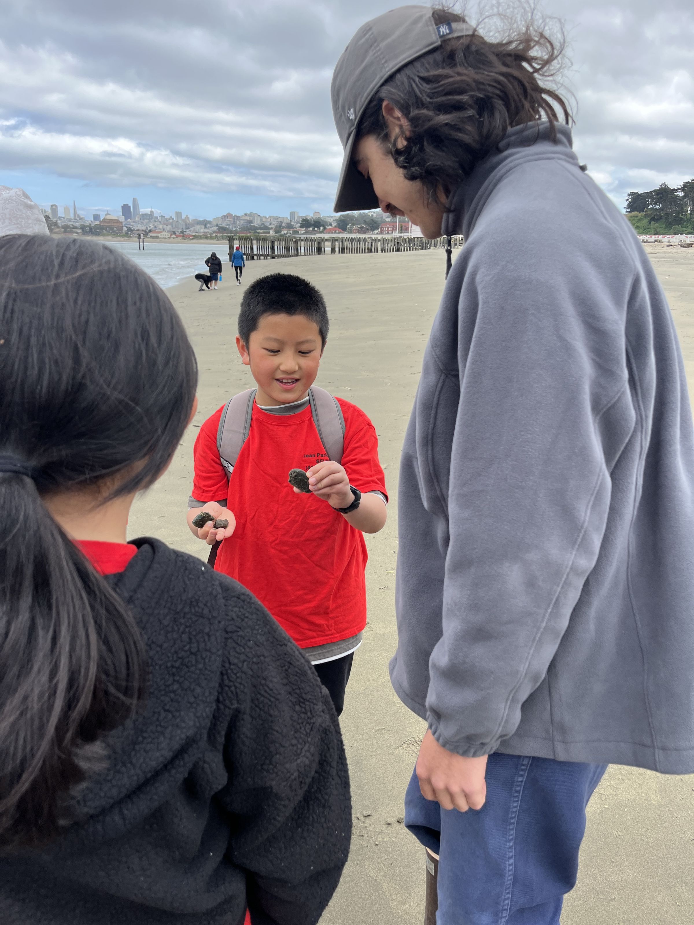 An afterschool student from Jean Parker Elementary asking an educator about his findings on a sandy beach during a field trip to Crissy Field in San Francisco. Photo Credit: Sagit Betser