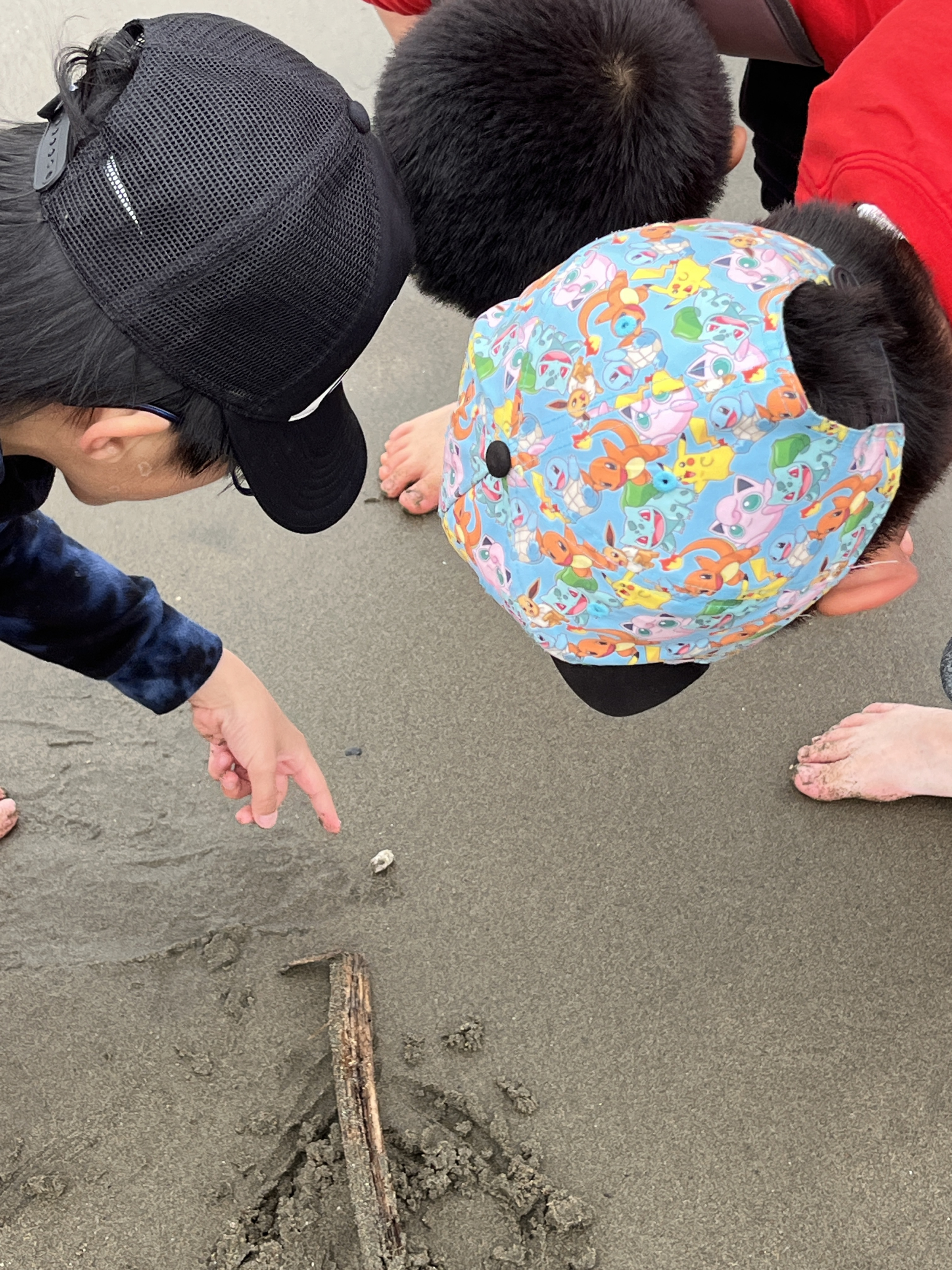 Students from Jean Parker Elementary crowd around and point out a sand crab they found on the beach. Photo Credit: Sagit Betser