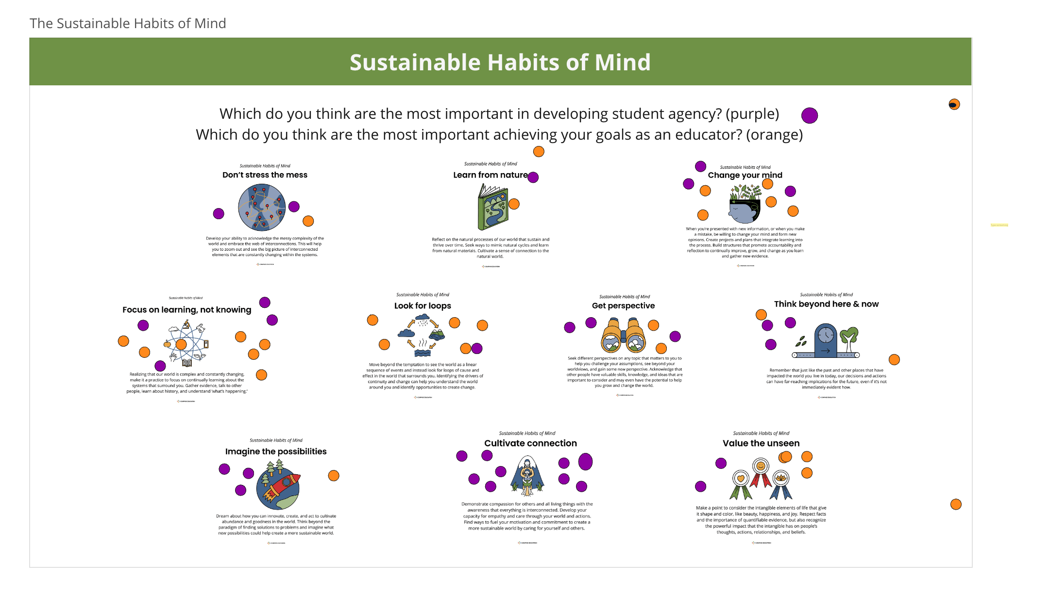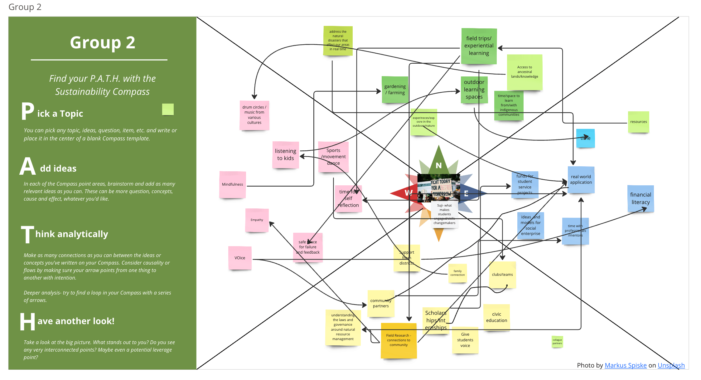 - Eric Oldmixon, Arts Department and Eco-Committee Chair at The Branson School in CA, USA, used The Sustainability Compass with his intergenerational Eco-Committee to explore how they might create “a fully sustainable food program at Branson.”