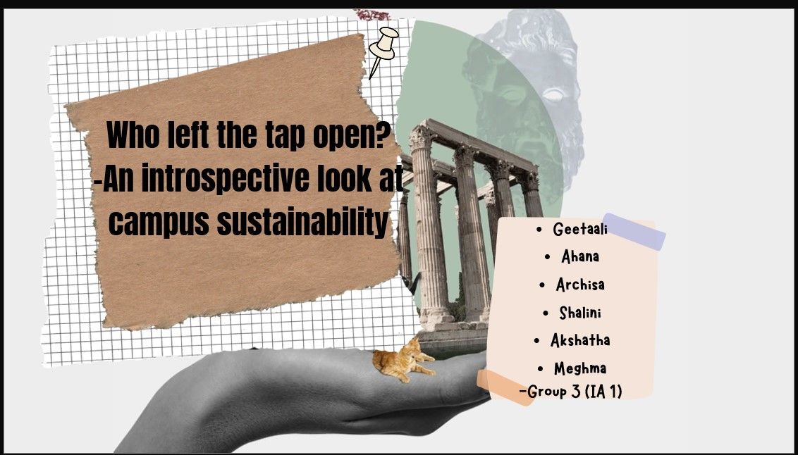 Presentation slide on campus sustainability by student group three. Slide credit: Meghma, Shalini Praveen, Geetali, Ahana, Akshatha