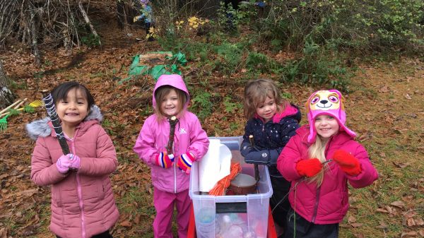 As we leave the school building, we activate our senses by putting on our “owl eyes”, “deer ears”, and “bear noses”. We stop at “Lookout Mountain” to see what has changed in the landscape from the previous week. The children notice even the most subtle changes in the landscape there. Next, we go to our forest classroom and play an organized game, have a short circle time, and then spend the rest of the session enjoying some forest free choice play. We have developed several centers. A mud kitchen, coyote hill, the tire swing, climbing hill, loose parts, and I usually have one special activity. The special activity is sometimes an art project or a cooperative project like building a fort or a scarecrow. I always give the children a 5-minute warning when free choice play will be ending. We have a token reward system when our children follow our 3 Cares: Taking Care of Ourselves, Taking Care of Others, and Taking Care of Our Environment.