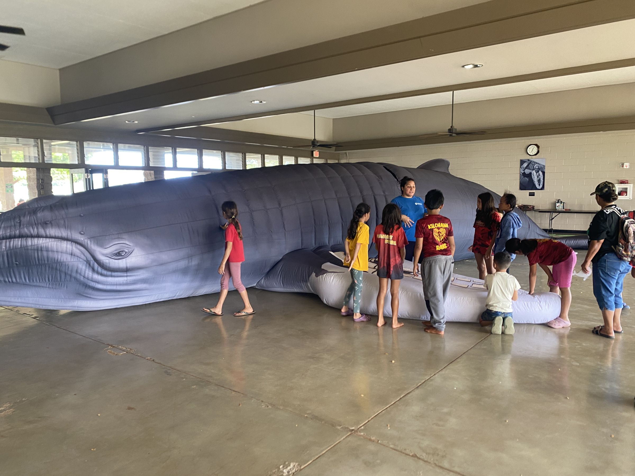 The giant inflatable Humpback whale, affectionately known as “Kamakai”, arrived on the Island of Molokaʻi on April 2. This life-size whale was blown up at the Mitchell Pauole Community Center in Kaunakakai by partners from the Hawaiian Islands Humpback Whale National Marine Sanctuary. Student groups from four 21st Century Community Learning Centers (21st CCLCs) on the island rotated through learning activities, both inside and outside of the life-size whale, over the course of three full days. Cindy Among-Serrao from the National Oceanic and Atmospheric Administration (NOAA) hosted students and guided them inside the whale to investigate the internal anatomy, including its three-stomach digestive system. Learning Endeavors and 21st CCLC partner staff also engaged students in creating whale puppets, playing whale trivia games, and learning how scientists monitor Humpback whales by identifying their tails, called “flukes.”