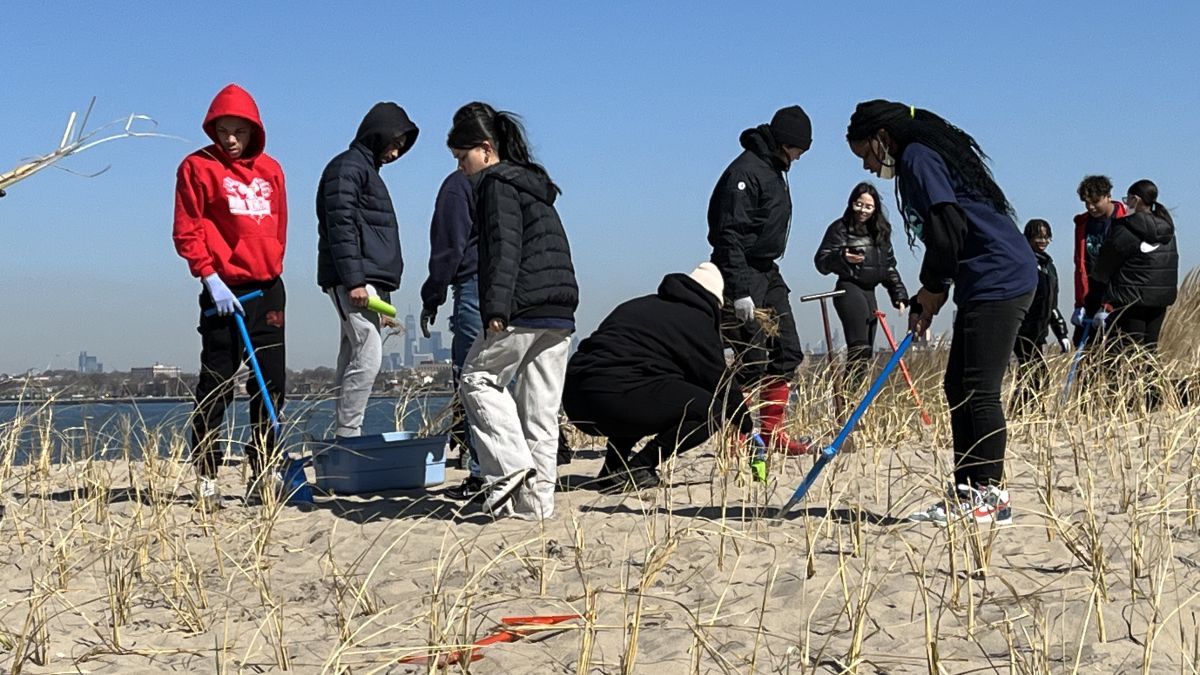 A group of kids on a beach in New York planting dune grass as part of the NWF RiSC program. Photo credit: Emily Fano