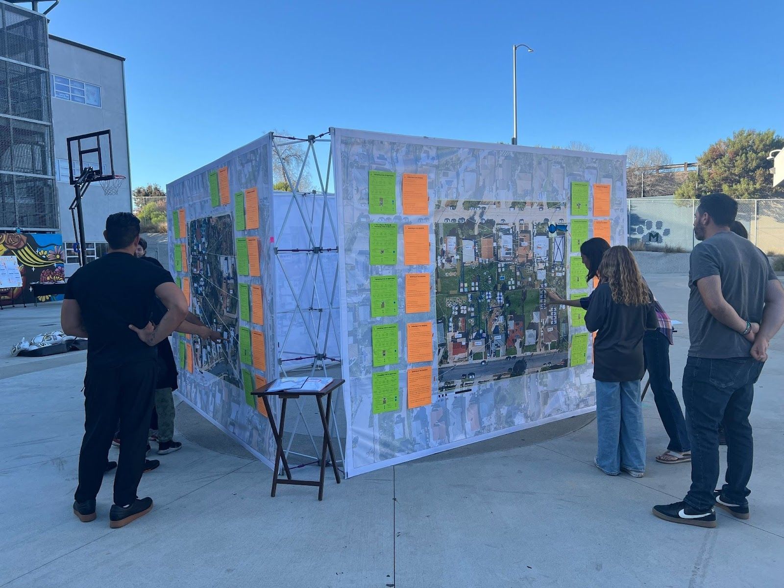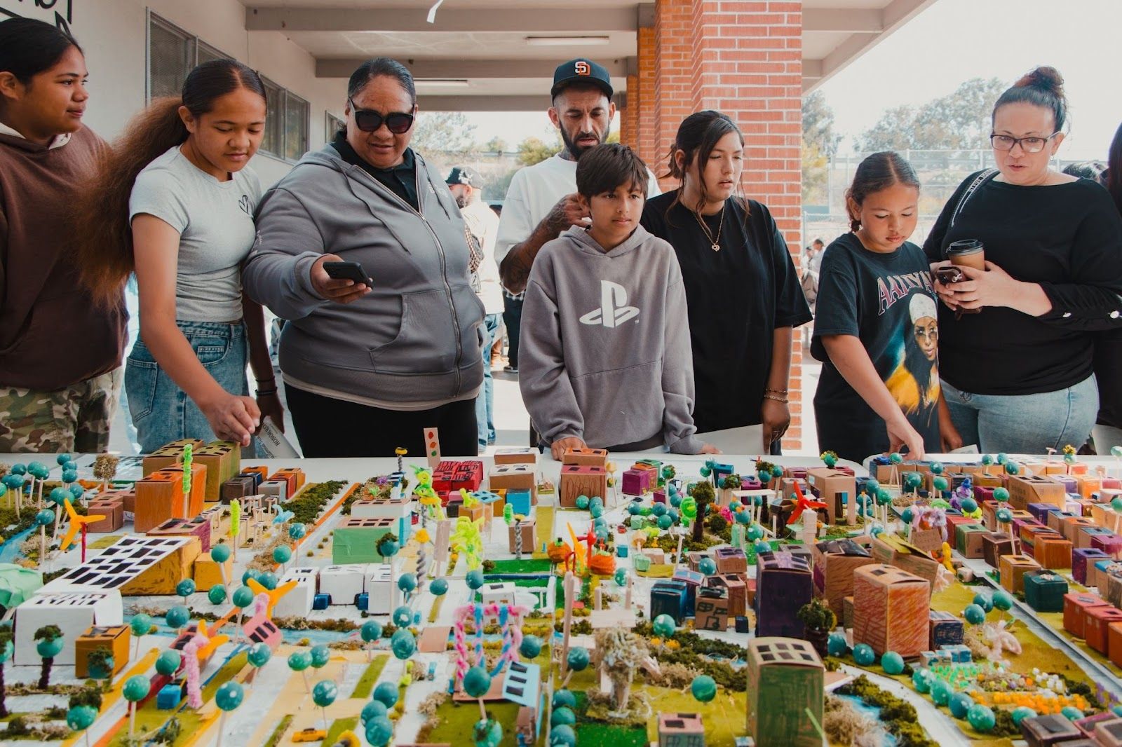 7th Grade Showcase: Students and parents interact with the map where 7th graders designed a neighborhood scale farming community. Photo credit: Groundwork San Diego—Chollas Creek