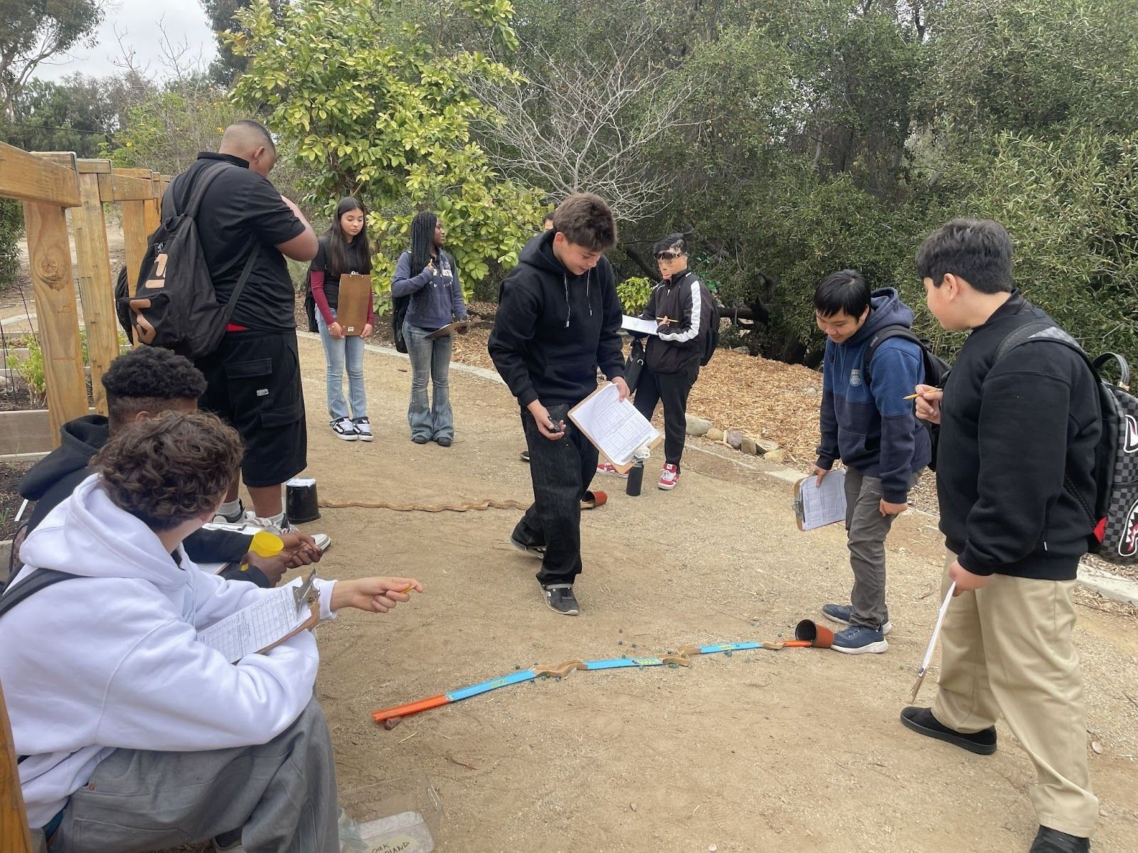 8th graders ram time trials on river configurations to measure the speed and calculate the kinetic energy of the water (marbles) as it flows through natural or channelized river systems. Photo credit: Groundwork San Diego—Chollas Creek.