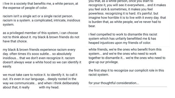"i live in a society that benefits me, a white person, at the expense of people of color. racism isn't a single act or a single racist person. racism is a system. a complicated, intricate, insidious system. as a privileged member of this system, i can choose not to think about it. my black & brown friends do not have that choice. my black & brown friends experience racism every day. often times it's sooo subtle... so absolutely insidious... that we don't even recognize it. racism doesn't always wear a white hood so we can identify it easily. we must take care to notice it. to identify it. to call it out. it's even in our language... deeply rooted in the way we communicate... and when i think deliberately about that, it really f--- with my head. but now, i see racism every day. if my white friends open your eyes, you might see it, too. but i will warn you that, as a white person, once you start to recognize it, you will see it everywhere... and it makes you feel sick & sometimes, it makes you feel powerless. recognizing it is hard. it's painful. but imagine how horrible it is to live with it every day. that is burden that, as white people, we've never had to bear. i feel compelled to work to dismantle this racist system which has unfairly benefitted me & has heaped injustices upon my friends of color. white friends, we're the ones who benefit from this system... and we're the ones who need to work together to dismantle it... we're the ones who need to give up our privilege. the first step is to recognize our complicit role in this racist system. for your thoughtful consideration..." -Carrie Samis
