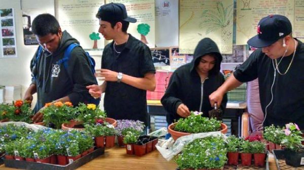 JLCDS is a small high school in the Los Angeles Unified School District, the largest school district in California. At JLCDS, sustainability is not only about the environment, it’s also about empowering students to redirect their lives and learn to become positive agents of change through an ethic of environmental citizenship. Jack London practices sustainable, urban horticulture as a way to meet the needs of the 21st century and manage an increasingly urban environment. Much of the effort involves container gardening on asphalt, the quintessential urban environment. The garden consists of 30 raised beds, two asphalt cuts, 47 fruit trees, and numerous pots. JLCDS designed and built their own raised beds. Vegetables, herbs, berries and fruits are grown organically and the garden literally bursts through the fences.