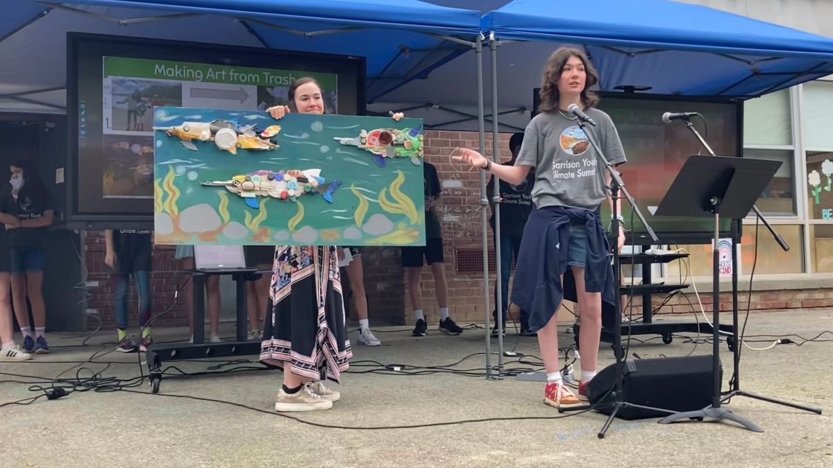 8th grader describes the art piece she made to illuminate human threats to Sturgeon, an endangered local species, from the trash she collected at a community clean-up event. Photo courtesy of Garrison Union Free School District