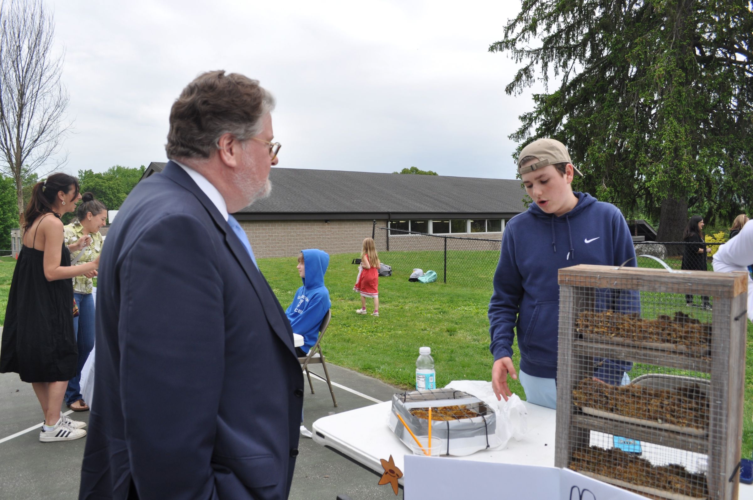 8th grader at the evening event showcases the self-sustaining moss air filtration system he engineered from upcycled materials to NY State Senator Pete Harckham. Photo courtesy of Garrison Union Free School District