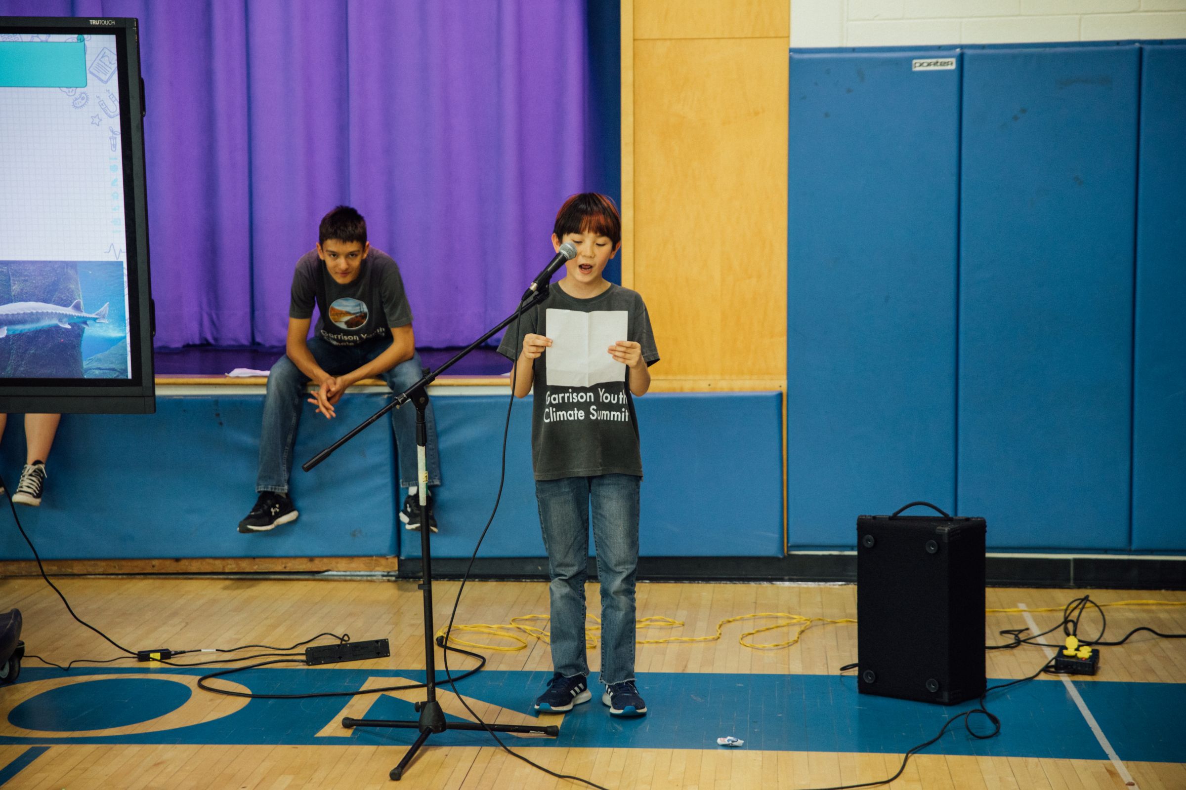 Garrison 5th-grader explains the impact water pollution has on local waterways in his Keynote Presentation at the evening event of the Youth Climate Summit on May 12th, 2023. Photo Credit: Erik Wik