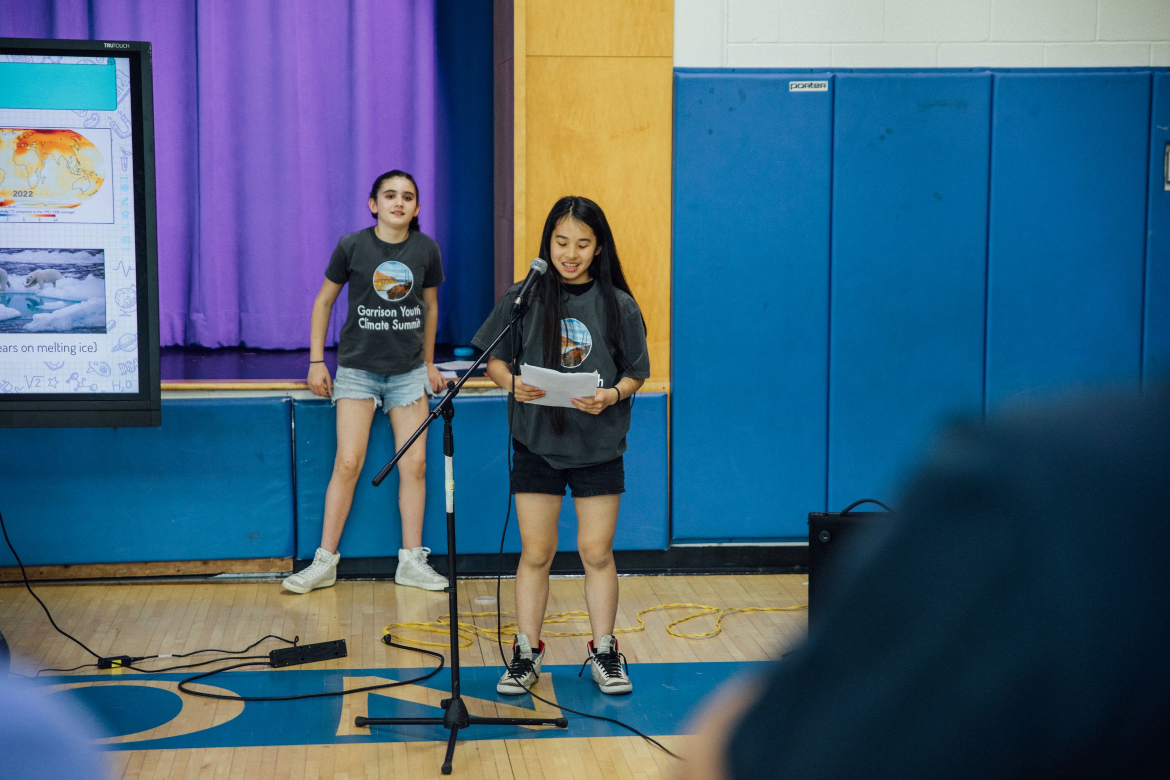 Garrison 6th-grade Keynote Presenter shares her intergenerational climate story, describing the perspective of her grandparents in Japan, at the evening event of the Youth Climate Summit on May 12th, 2023. Photo Credit: Erik Wik
