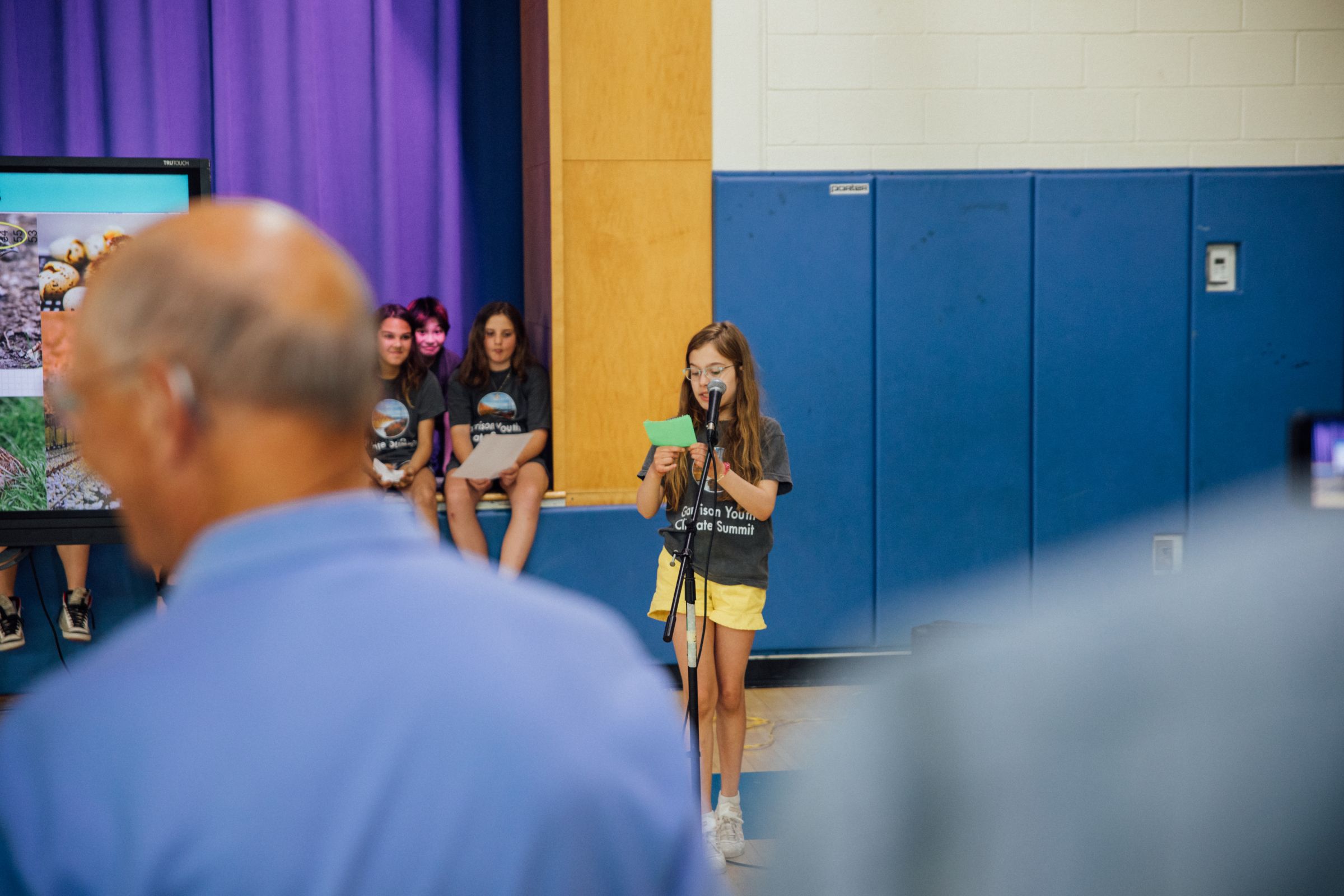 Garrison 8th-grade Keynote Presenter explains the correlation between rising temperature and increases in atmospheric CO2—and how that correlation impacts the severity and frequency of wildfires. Photo Credit: Erik Wik