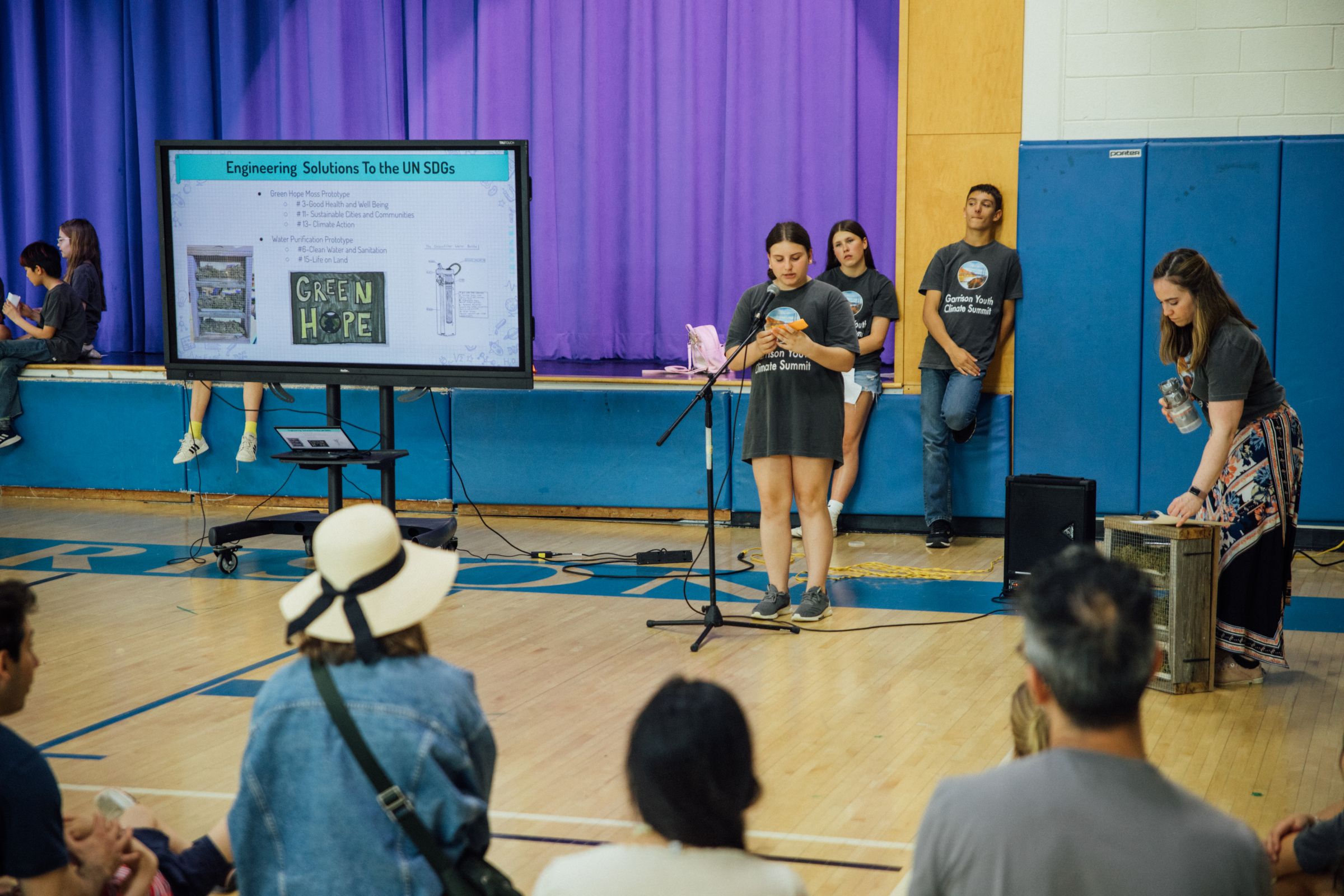 Garrison 7th-grade Keynote Presenter uses her STEAM group's prototype (named "Green Earth Moss") as an example of how biomimicry can address UN Sustainable Development Goals toward Good Health, Sustainable Cities, and Climate Action. Photo Credit: Erik Wik