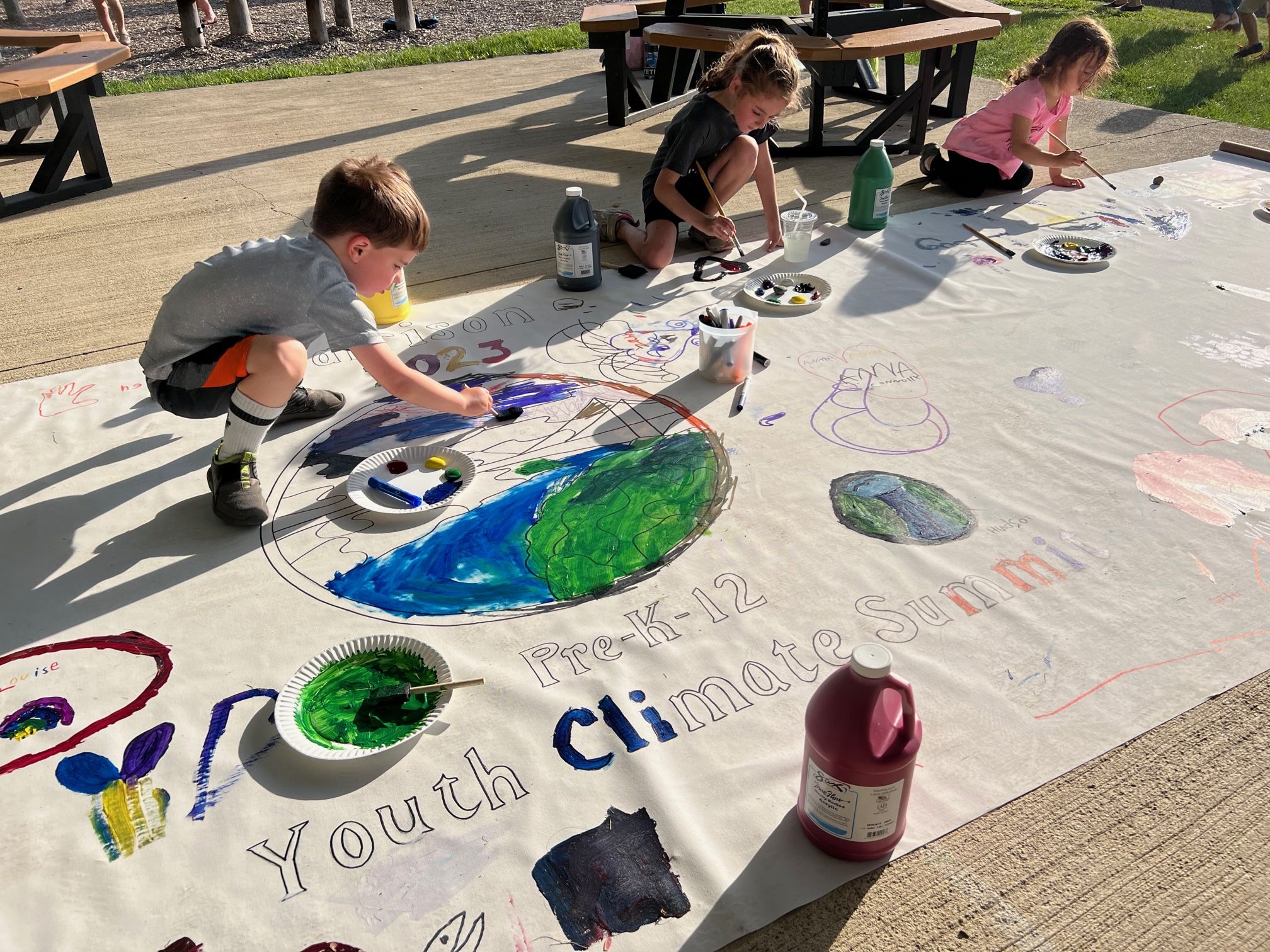Community members and students alike leave their mark on the sustainability-themed community art mural at the evening event of the Youth Climate Summit on May 12th, 2023. Photo courtesy of Rachel Arbor