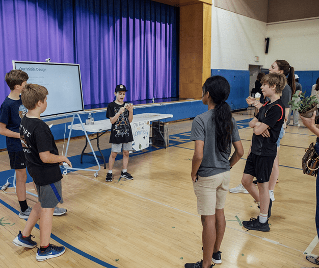 7th-graders present their long-term biomimicry project (the "Chlorofilter") from STEAM class, focused on extracting Chlorophyll from Christmas tree waste to harness in a dissolvable tablet for users to gain its health benefits.