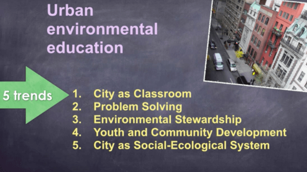 To begin your reflection, watch this 10-min video. Based on diverse urban environmental education goals described in joural articles and books, we identified five broad trends of urban environmental education, and we invite you to think how they apply to your program: