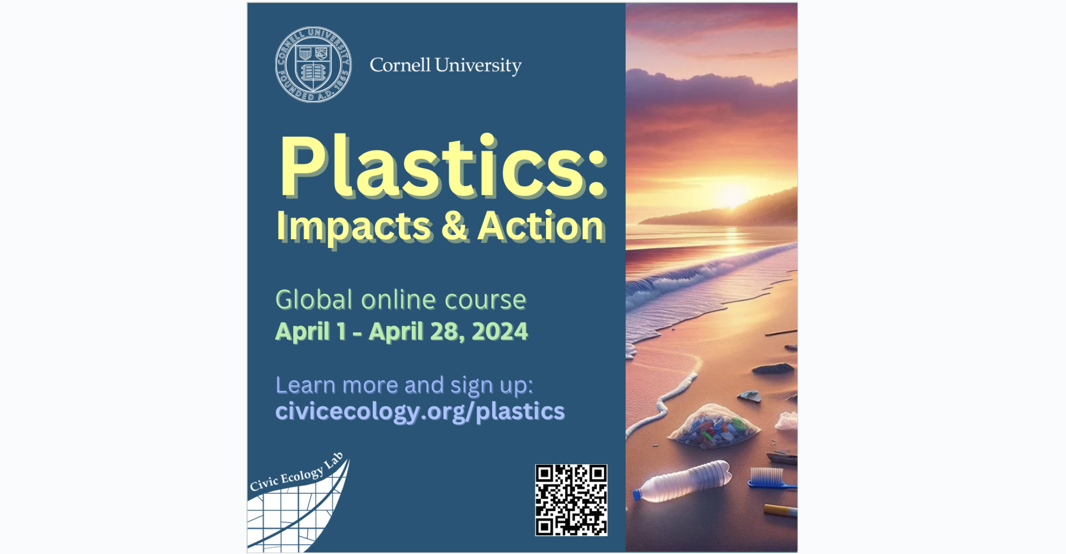 The Civic Ecology Lab at Cornell University offers a 4-week online course titled "Plastics: Impacts and Action," scheduled from April 1 to April 28, 2024. This course is designed for educators, teachers, students, policy-makers, community leaders, and volunteers interested in learning about the environmental and social impacts of plastics.