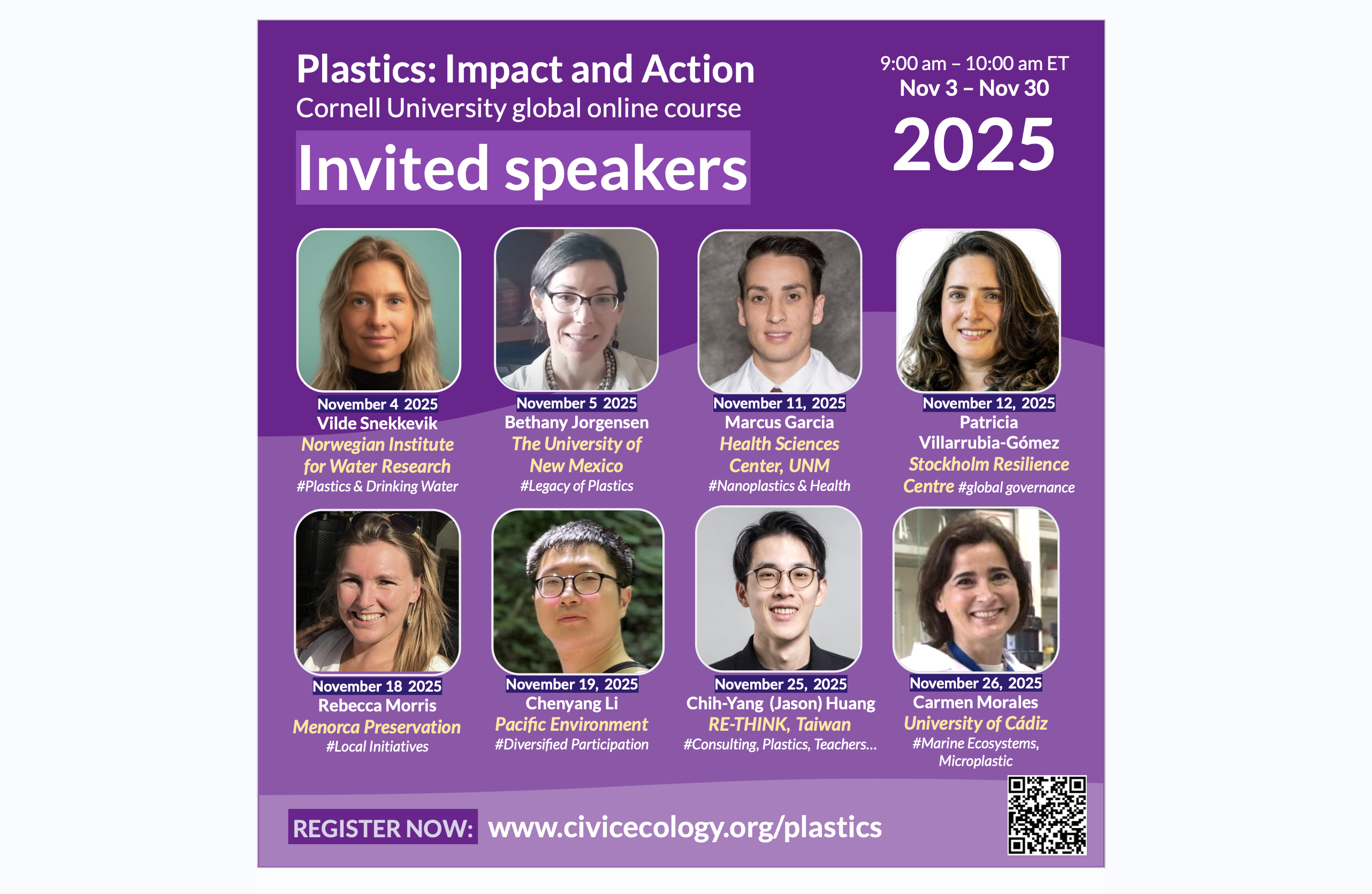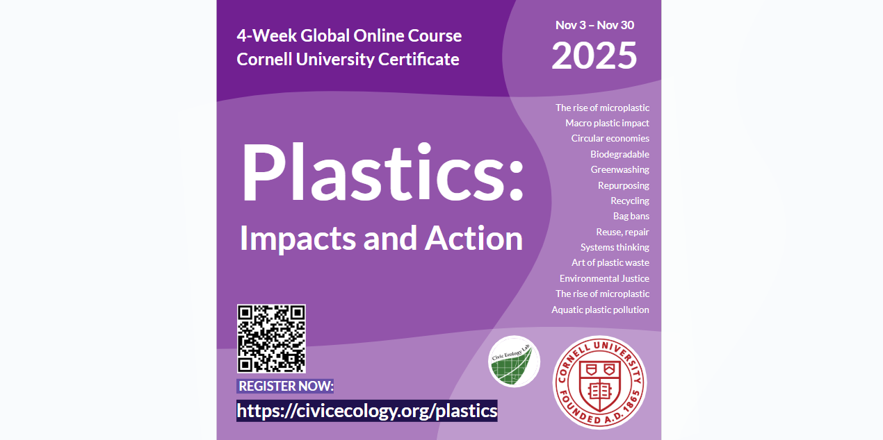 Join Cornell’s Civic Ecology Lab for a 4-week global online course, “Plastics: Impacts and Action” (Nov 3–30, 2025). The course blends asynchronous modules, expert webinars, and a peer-reviewed capstone, so you finish with a read-to-use learning activity or an implementable action plan focused on plastics: http://civicecology.org/plastics