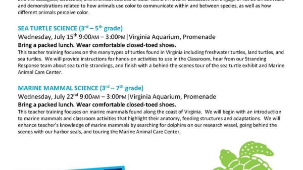 SEA TURTLE SCIENCE (3rd – 5 th grade) Wednesday, July 15th 9:00AM – 3:00PM|Virginia Aquarium, Promenade Bring a packed lunch. Wear comfortable closed-toed shoes. This teacher training focuses on the many types of turtles found in Virginia including freshwater turtles, land turtles, and sea turtles. We will provide instructions for hands-on activities to use in the Classroom, hear from our Stranding Response team about sea turtle strandings, and finish with a behind-the-scenes tour of the sea turtle exhibit and Marine Animal Care Center.
