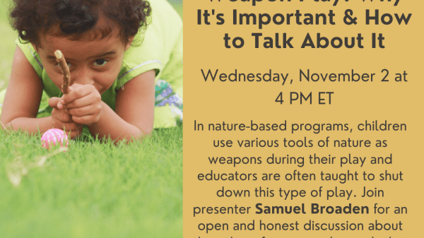 In nature-based programs, children use various tools of nature as weapons during their play and educators are often taught to shut down this type of play. Join presenter Samuel Broaden for an open and honest discussion about the value of weapon play and what children are learning when they play this way.