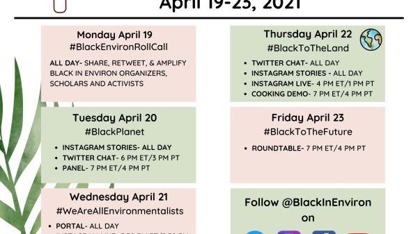 Join Black in Environment for a fantastic lineup of events and speakers from April 19–23rd, and be sure to follow @BlackinEnviron on Instagram and Twitter for daily stories and chats.
