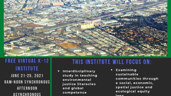A free virtual institute for California teachers: June 21-25, 2021 from 9am–12pm synchronous with afternoon time asynchronous. This institute will feature interdisciplinary study in teaching environmental justice literacies and global competence; and examining sustainable communities with a social, economic, and spatial justice, and ecological lens.