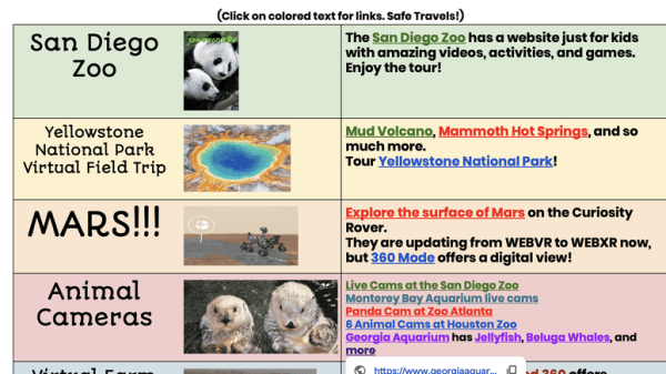 Resource 30 Virtual Field Trips Type Resource Website Media Multimedia Links Over 30 Virtual Field Trips with Links Share Facebook LinkedIn Pinterest Email Copy URL Over 30 Virtual Field Trips with Links https://docs.google.com/document/d/1SvIdgTx9djKO6SjyvPDsoGlkgE3iExmi3qh2KRRku_w/preview?pru=AAABcQTpcvo%2A1SUyF3QzAL8hhmWGT2F0-A&fbclid=IwAR3uNJPLH1Tn2qQGuYVspJ_g6uRWou_yM3XrtsbAXfOz2dvceT5l5Y1TGNw (For the link to the Google Doc. Safe Travels!)